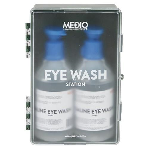 - MEDIQ Saline eyewash contains a 0.9% sodium chloride solution that corresponds to the natural salt content of the eye fluid.